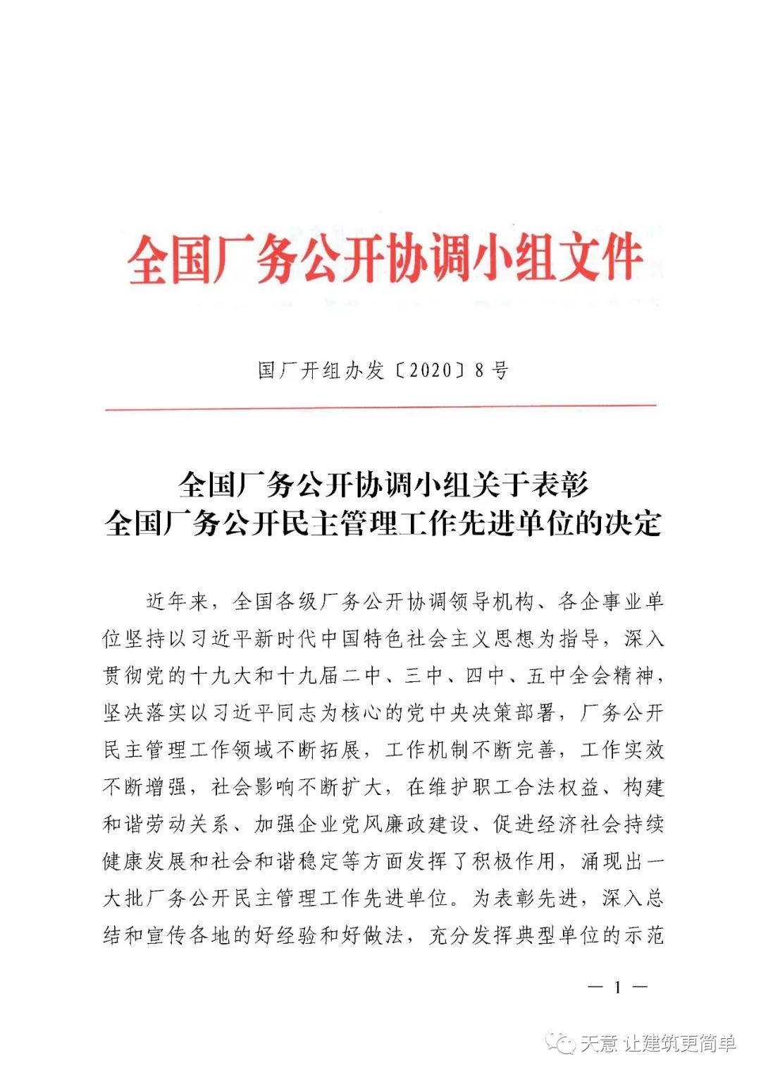 喜訊丨祝賀天意機械被授予“全國廠務(wù)公開民主管理先進單位”稱號
