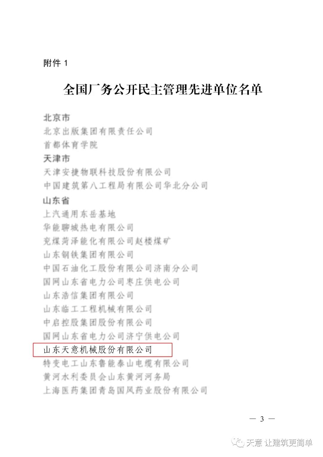 12月11日,從全國總工會傳來喜訊,山東天意機械股份有限公司被授予“全國廠務(wù)公開民主管理先進單位”稱號。