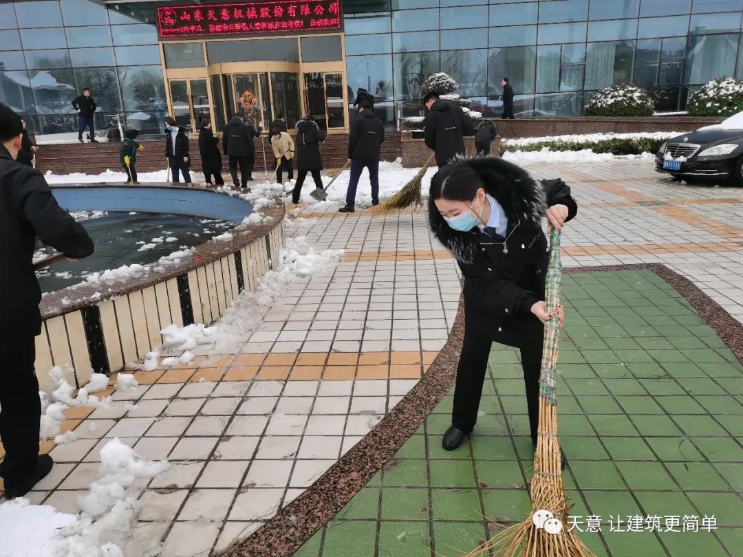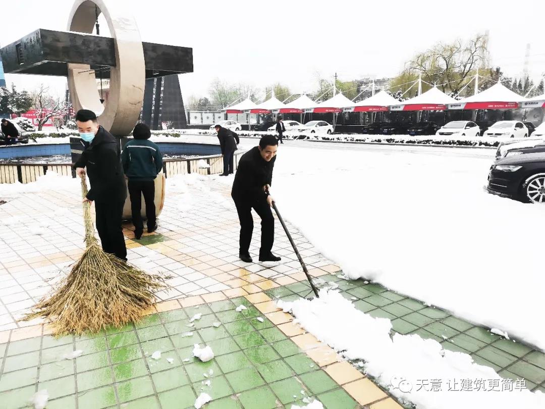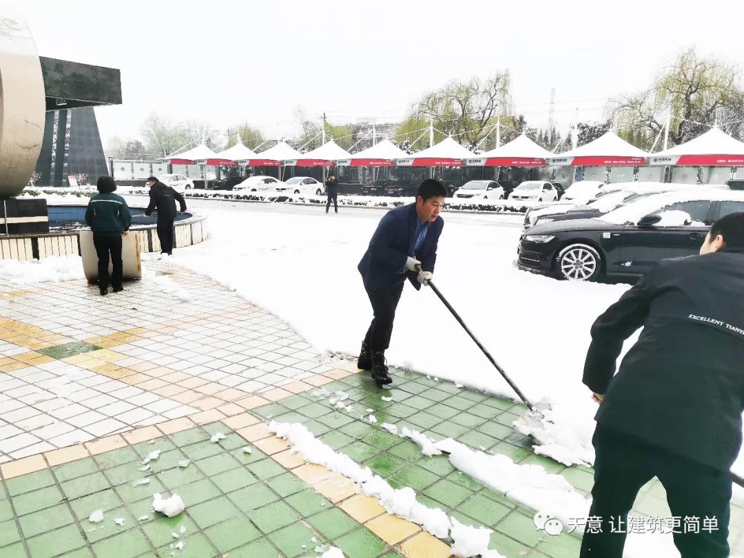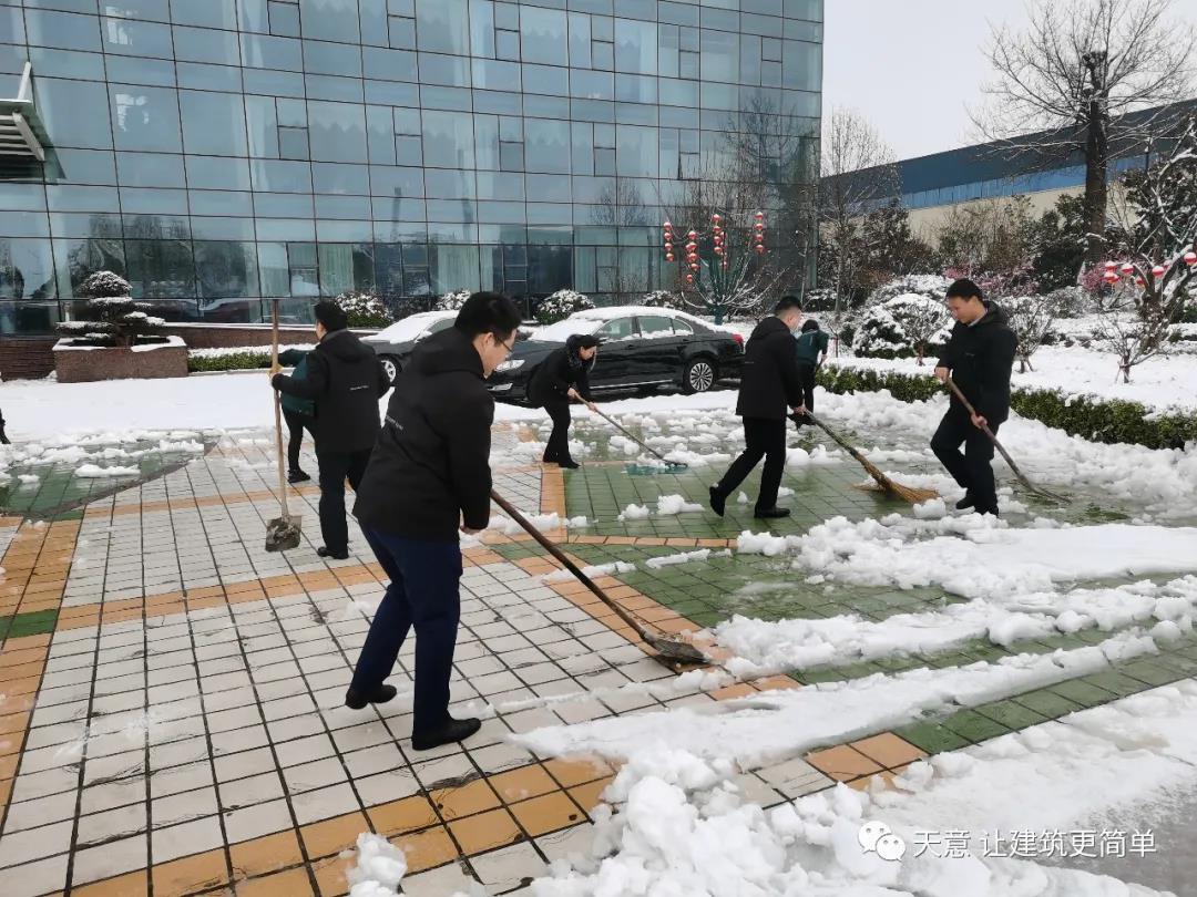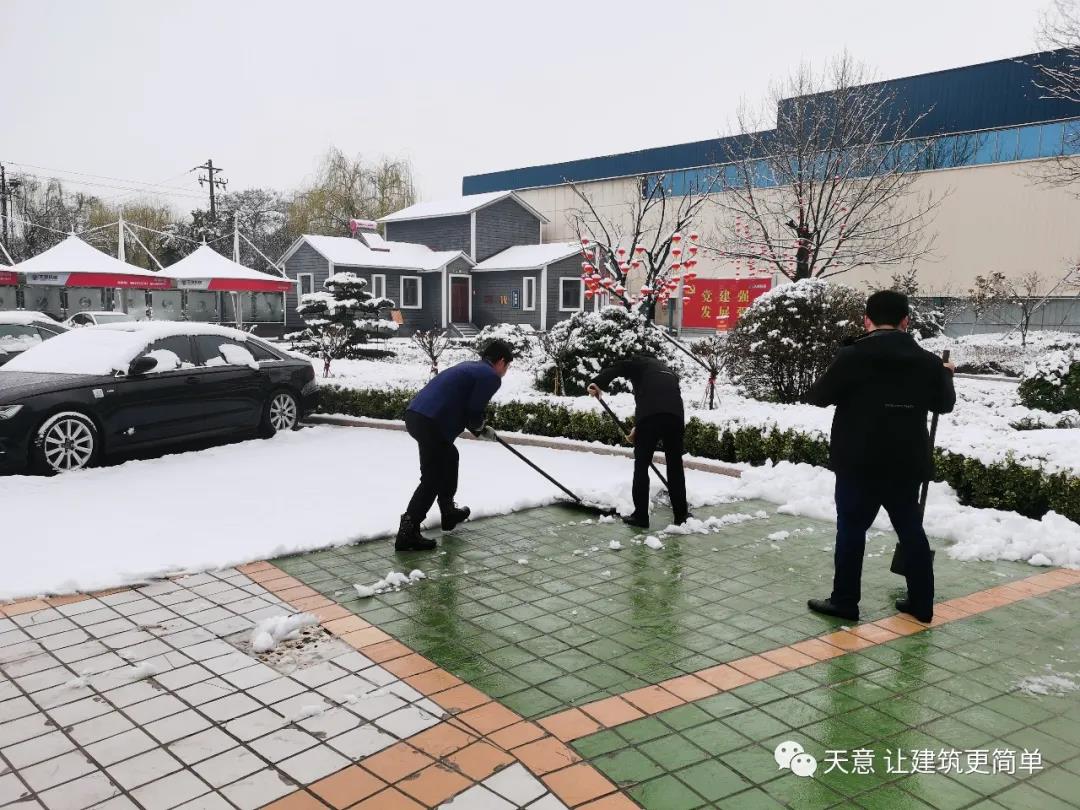 大雪悄然而至,一覺起來,窗外已是銀裝素裹。然而大雪的降臨也給大家的出行帶來諸多不便,公司大門口、辦公樓前的道路都被皚皚白雪覆蓋。早晨上班前,公司總經(jīng)理劉海龍、營銷總監(jiān)郭川東帶領(lǐng)公司員工拿起掃帚鐵锨,滿懷激情,投入除雪當(dāng)中。整個(gè)除雪作業(yè)過程井然有序,熱火朝天,干勁十足,大家不懼寒冷,不怕手凍。鐵锨和地面的碰擊聲、掃帚清掃雪花的刷刷聲,不一會(huì)兒辦公樓前的積雪已蹤影全無,所到之處,雪沒了,路干凈了,掛滿枝頭的冰凌隨風(fēng)婆娑起舞,點(diǎn)頭稱贊,大家的心中更是無比的欣慰,雖然凍紅了臉、累出了汗,但累并快樂著。