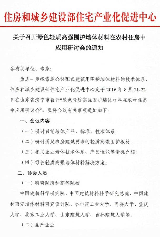 為進(jìn)一步探索適合裝配式建筑用圍護(hù)墻體材料的技術(shù)體系,住房和城鄉(xiāng)建設(shè)部住宅產(chǎn)業(yè)化促進(jìn)中心定于2016年8月21-22日在山東濟(jì)寧市兗州區(qū)召開“綠色輕質(zhì)高強(qiáng)圍護(hù)墻體材料在農(nóng)村住房中應(yīng)用研討會”。