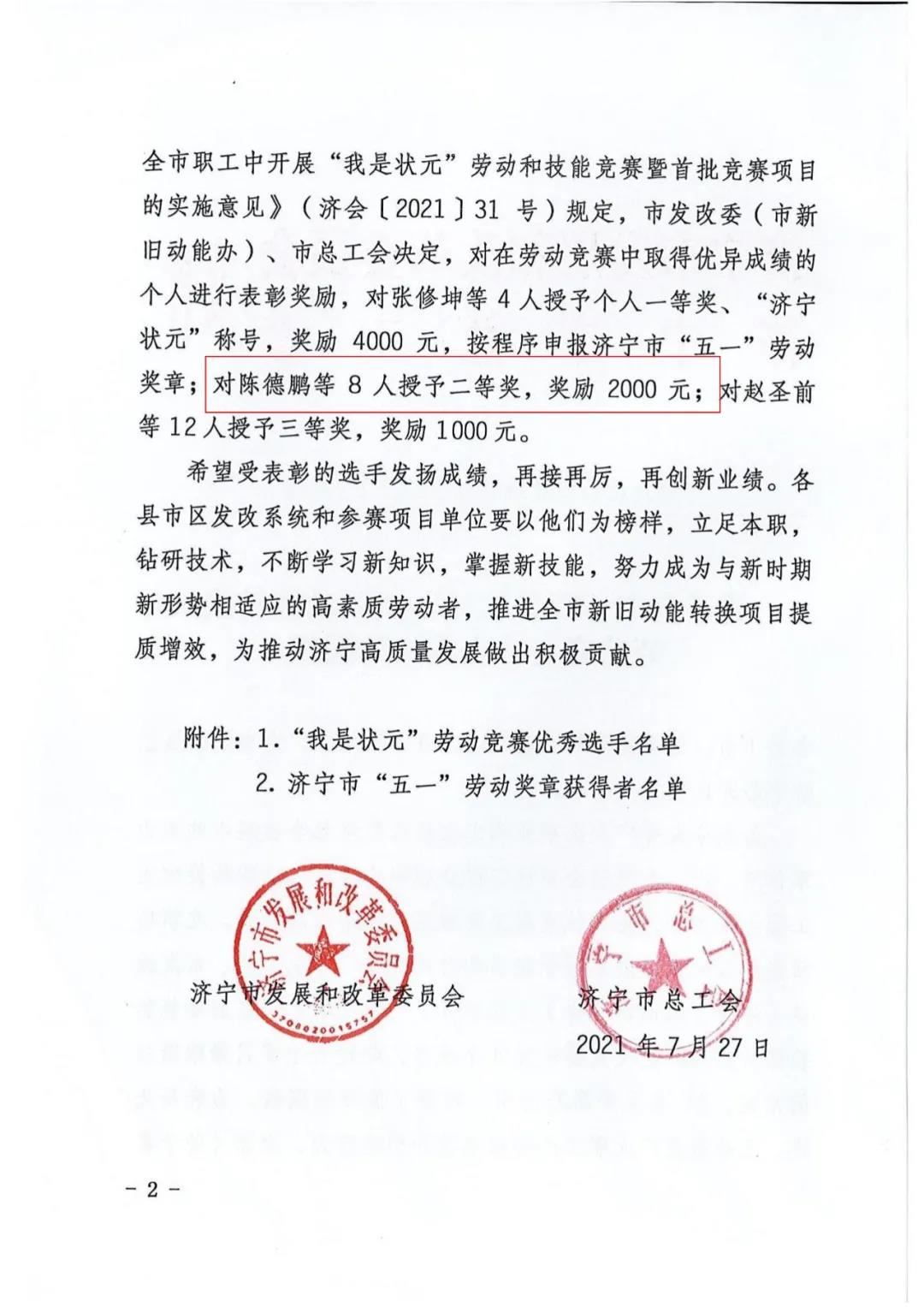 我司陳德鵬獲得濟(jì)寧市“我是狀元”勞動(dòng)競(jìng)賽新舊動(dòng)能轉(zhuǎn)換重大課題攻關(guān)競(jìng)賽單元二等獎(jiǎng)
