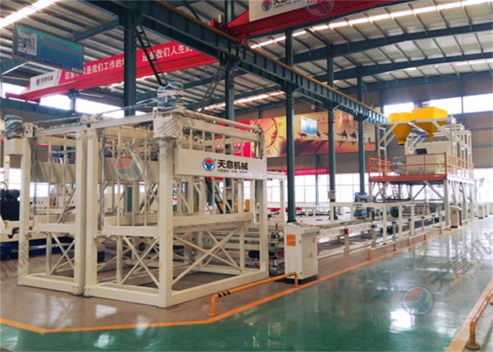 成型輸送線主要由上板輸送線、成型輸送線,加速整理輸送線及送板主機、布料主機、刮平裝置、玻纖網格布架等組成,主要功能是把漿料鋪設在EPS基板上并完成產品的成型,且輔助完成兩端雙工位碼垛機的上下架。